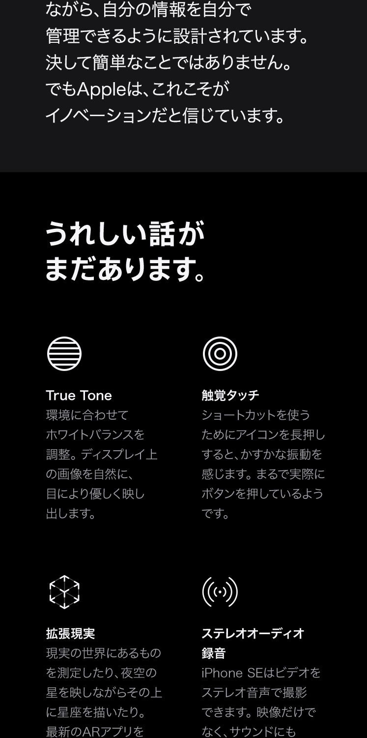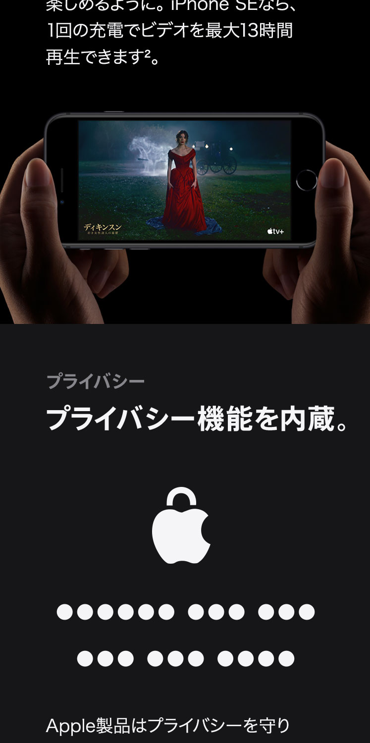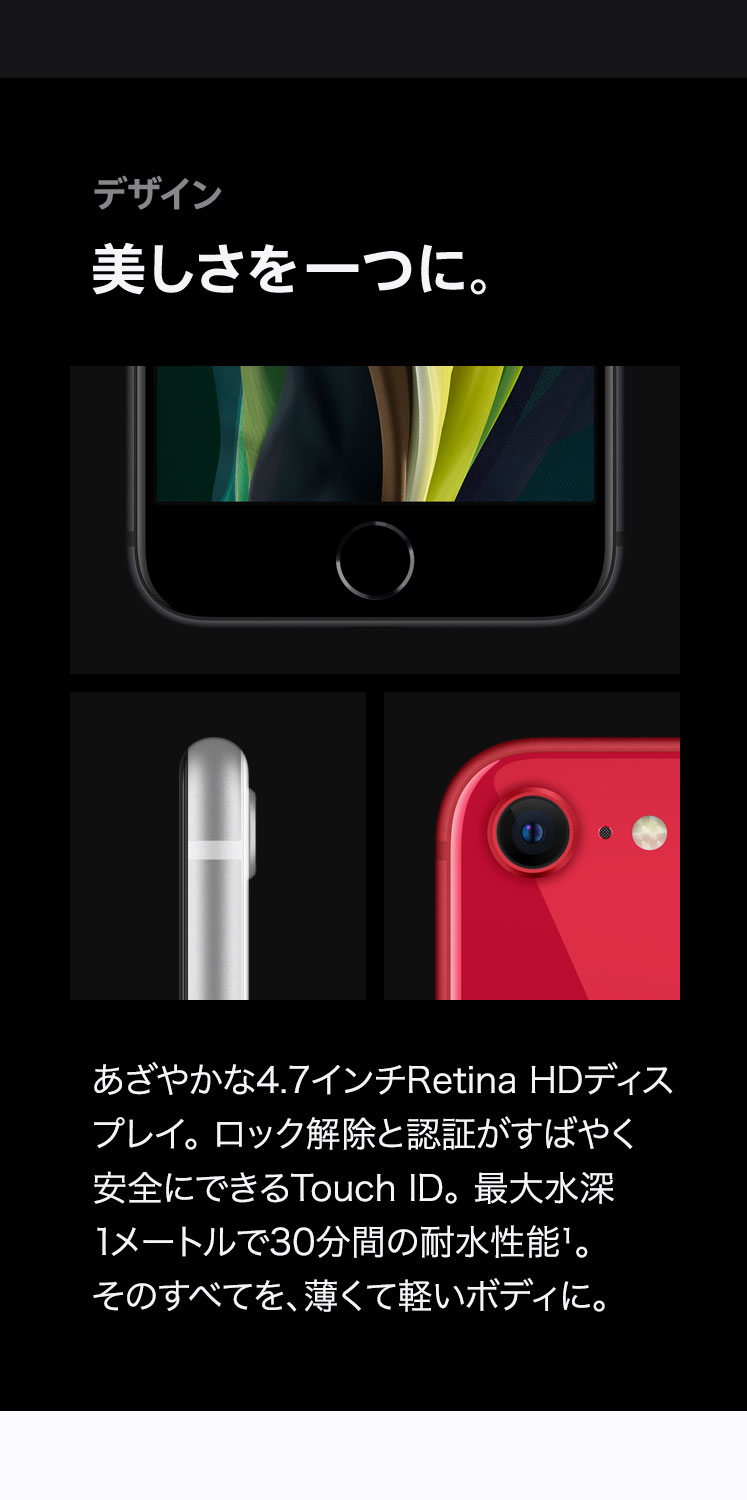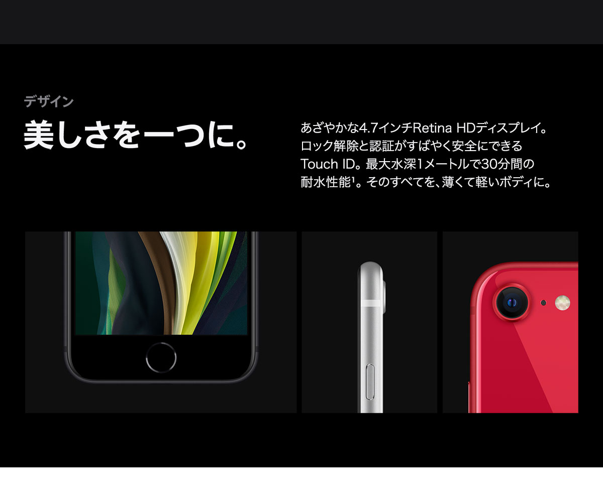 - iPhone SE(第2世代)は防沫性能、耐水性能、防塵性能を備えており、実験室の管理された条件下でのテストにより、IEC規格60529にもとづくIP67等級に適合しています(最大水深1メートルで最大30分間)。 防沫性能、耐水性能、防塵性能は永続的に維持されるものではなく、通常の使用によって耐性が低下する可能性があります。 iPhoneが濡れている場合は充電しないでください。クリーニングと乾燥の方法についてはユーザガイドをご覧ください。 液体による損傷は保証の対象になりません。