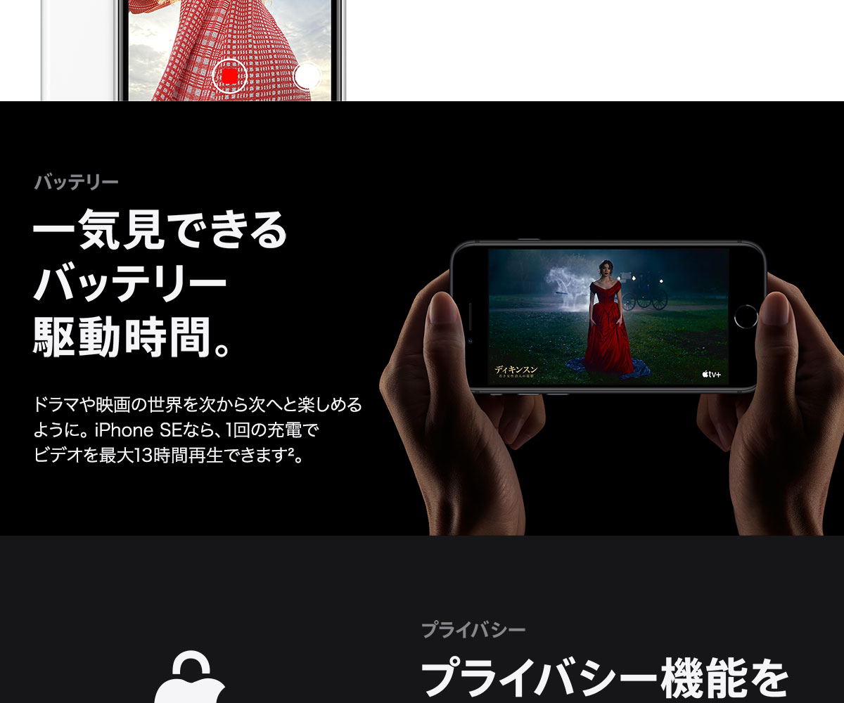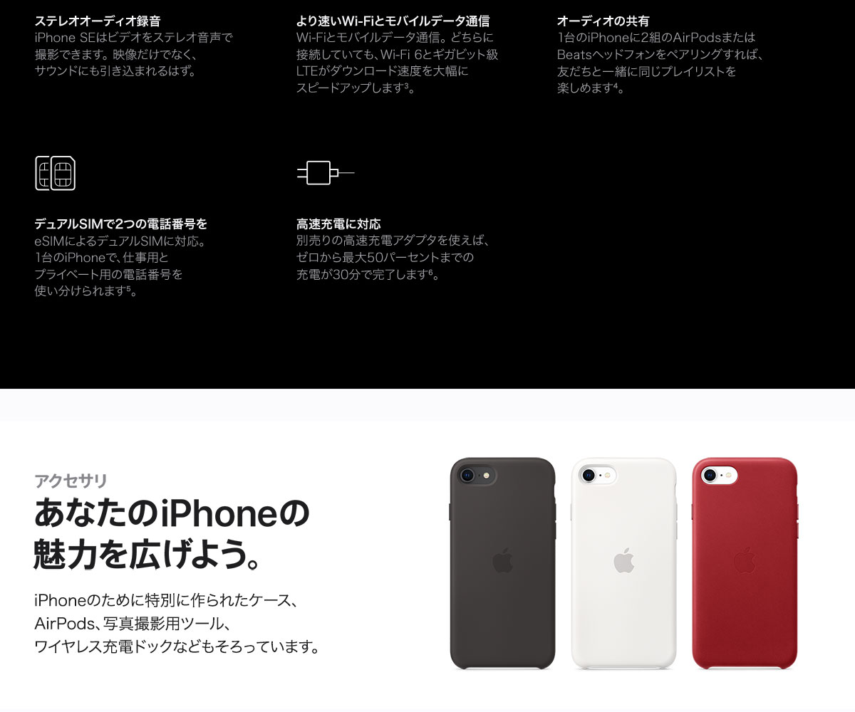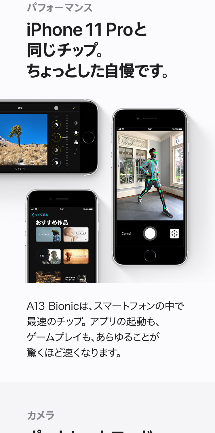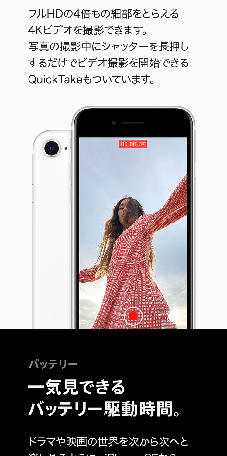 - iPhone SE(第2世代)の試作ハードウェアとソフトウェア、Apple USB-C電源アダプタ(18WモデルA1720と30WモデルA1882)アクセサリを使用し、2020年2月にAppleが実施したテスト結果によります。 高速充電のテストは、バッテリーを完全に消費したiPhoneハードウェアを使って実施しました。 充電時間は環境条件によって変わり、実際の結果は異なる場合があります。