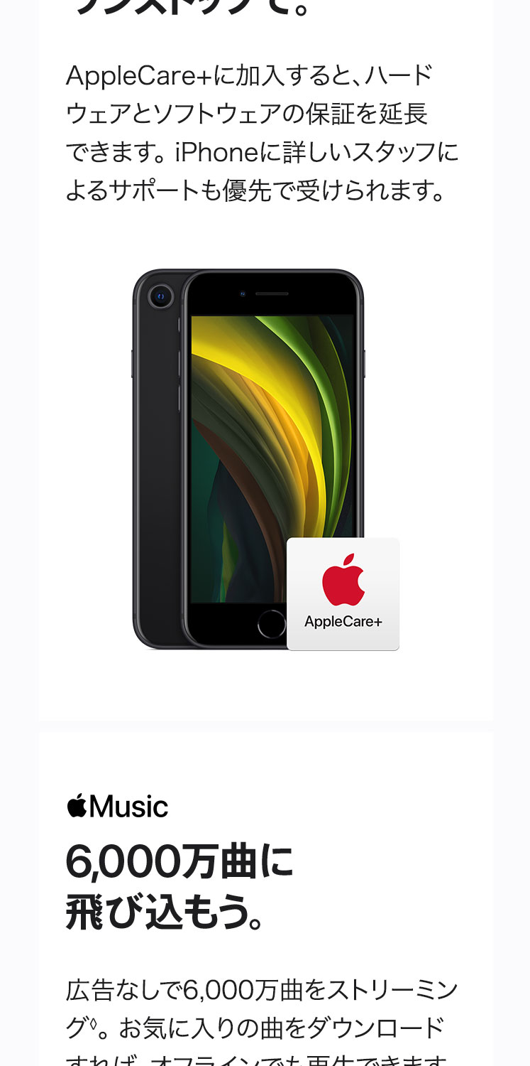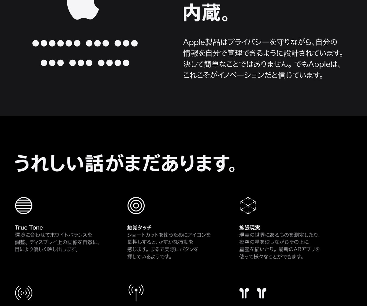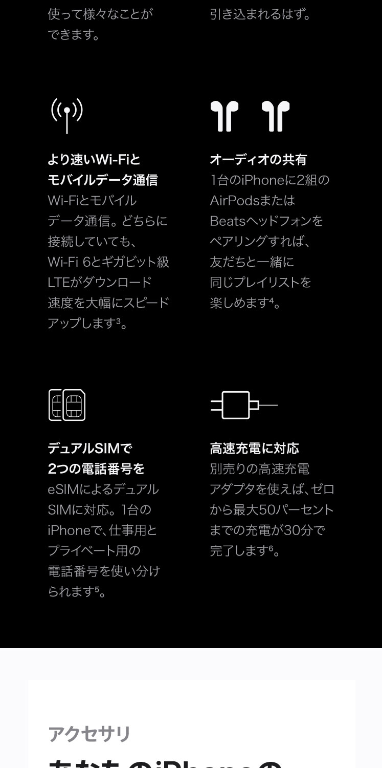 - バッテリーに関する各数値はネットワーク構成やその他の多くの要素によって変わり、実際の結果は異なる場合があります。 バッテリーは充電回数に限りがあり、将来的にはApple正規サービスプロバイダによる交換が必要になる場合があります。 バッテリー駆動時間と充電サイクルは使用方法と設定によって異なります。 詳しくはapple.com/jp/batteriesおよびapple.com/jp/iphone/battery.htmlをご覧ください。